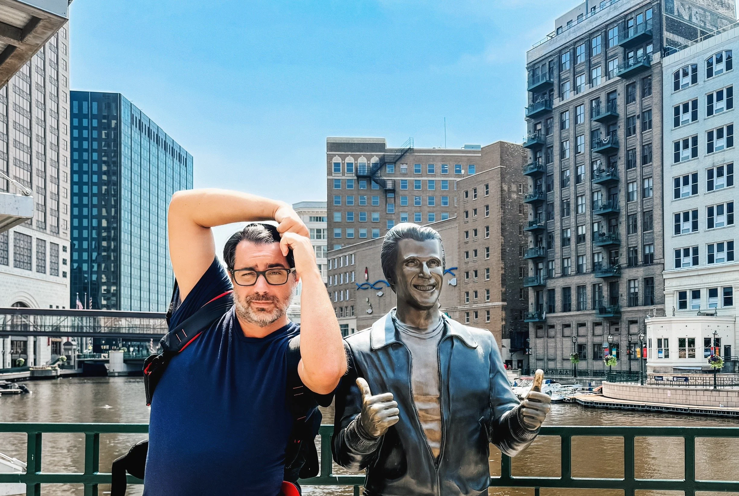It's early afternoon in Milwaukee. I just finished buying spices at an indoor market. I had some great food while visiting family in the Midwest and wanted to bring a taste of it back home. My father-in-law excitedly told me about all the great food spots in the city. The man is a helluva chef, and I take his recommendations to heart. He's got one more must-see location before I unfortunately had to catch a flight back: the Bronze Fonz. We weaved past multiple bridges on the river until we found it. Its location was a little unassuming, but it was exactly as advertised. It was Bronze, and it was undoubtedly the Fonz. I struck a pose mimicking combing my hair like a greaser as my wife snapped a quick pic. Happy Days was a touch before my generation, but I've seen plenty of episodes, and I firmly believe that Henry Winkler is a national treasure.